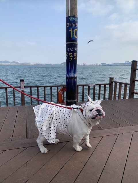 산책을 가면 ‘잘생겼네~’라는 말을 들어서, 공쥬 티 빵빵 내려고 원피스 착용!