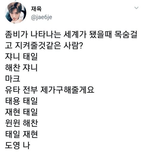 좀비한테서 목숨 걸고 지켜줄 것 같은 사람 서로 뽑은 태일군과 재현씨 ..... 이런거 뭔가 좋음 .. 약간 서로 의지 하는게 보여서 내가 다 든든해