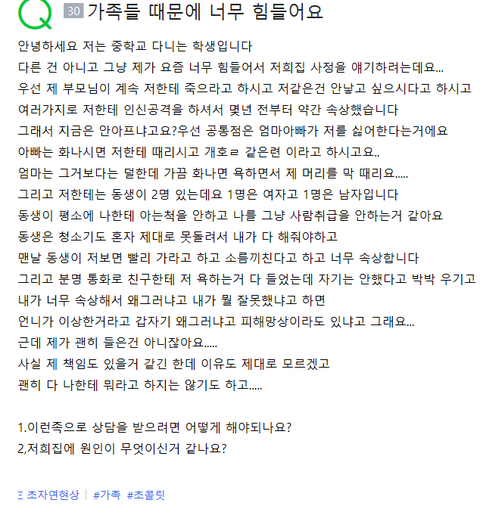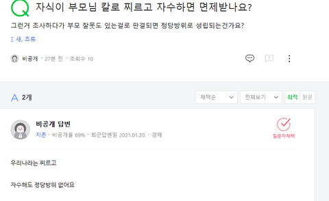 할거 없어서 지식인 최근질문 눈팅하는데 누가 지식인에 누가 자식이 부모님 칼로 찌르고 자수하면 면제받냐고 물어본글 있길래약간 컨셉글 같기도 해서 무시했거든 근데 몇십분 뒤에 지식인에 가족땜시 힘들다는 글 올라와있던데 이거 작성자가 약간 정신분열증 있는사람 같아.. 지식인 보다가 소름끼치는 글 있어서 링크 가져와봤는데 너희들 의견도 좀 남겨줘