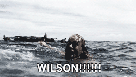 파도에 그만 윌슨이 떠밀려가자 오열하는 주인공
