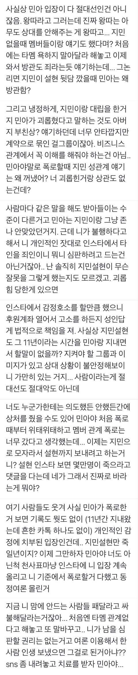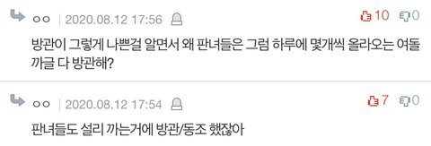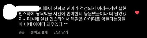 왕따가해자도 아닌 지민-민아 인간관계 문제인데 아직도 설현 인스타 댓글로 지랄중 방관은 민아도 설현 까일때 했는데 민아 상처준 가해자 지민보다 설현이 까이는건 말이안됨ㅋㅋㅋ 그리고 쭉빵여시 커뮤하는 애들은 반에 따돌림 당하는 친구 감싸주고 챙겨주고 그것도 가해자앞에서 그렇게 해준 적 있음? 설리 죽일듯이 쳐팼으면서 설리 떠나니깐 남초탓하더니 이번에 설현 잘못아닌거 밝혀지면 남초가 욕했다고 남초탓하게? 나 원래 설현 별로 좋아하는편 아니였는데 초반부터 지민보다 더 심하게 까여서 불쌍하게 느껴져서 쉴드치게됨ㅋㅋㅋㅋ 쭉빵여시언니들 또 aoa팬이라고 몰아갈거 같은데 나 구본진 남돌이고 aoa 좋아한적없음 커뮤하는 악플러들이나 방관한적 없고 피해자 챙겨준적 있냐는 질문에 대답 좀 해줬으면ㅠㅋㅋㅋ
