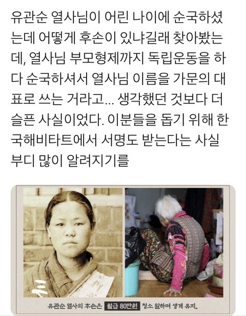 우리나라를 지키다 순국하신 유관순 열사님의 후손은 청소일로 월 80만원을 받으며 생계유지를 하고 계신대..