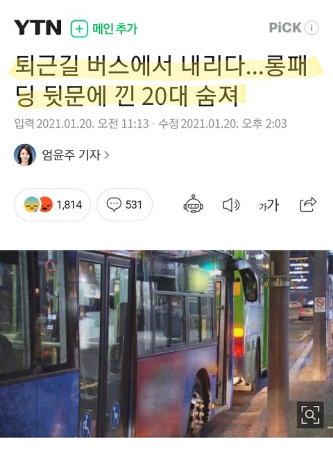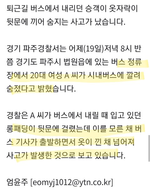 어떤 20대 여성분께서 퇴근길 버스에서 내리다가 롱패딩이 뒷문에 끼고 끌려가다가 뒷바퀴에 깔려죽으셨대.