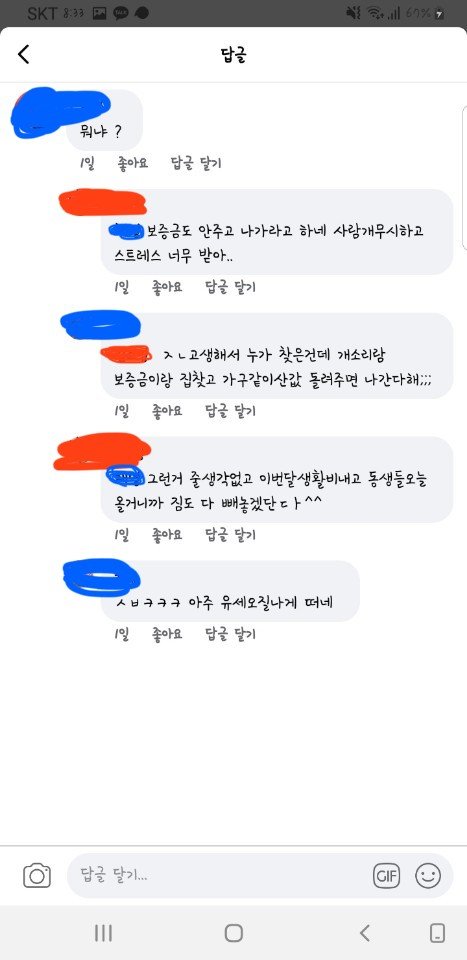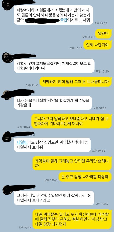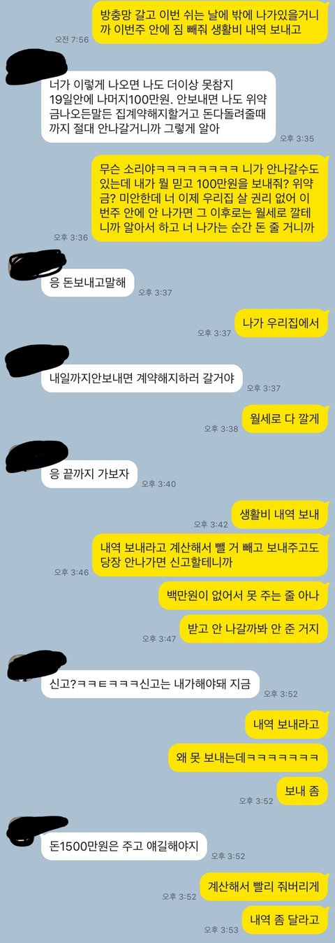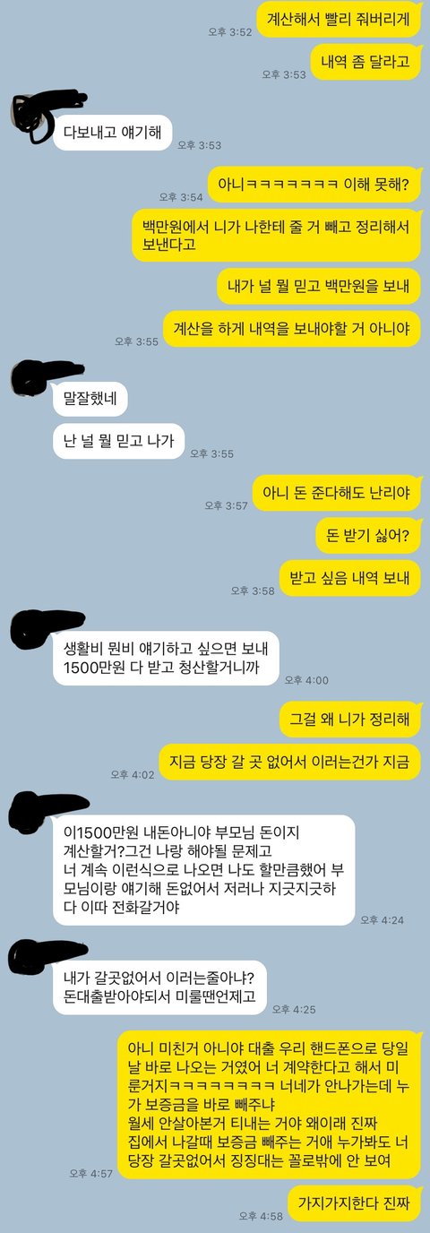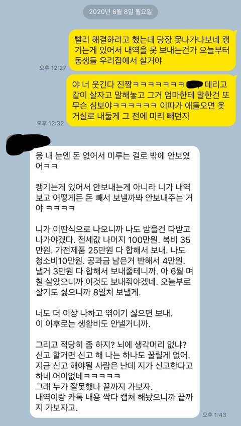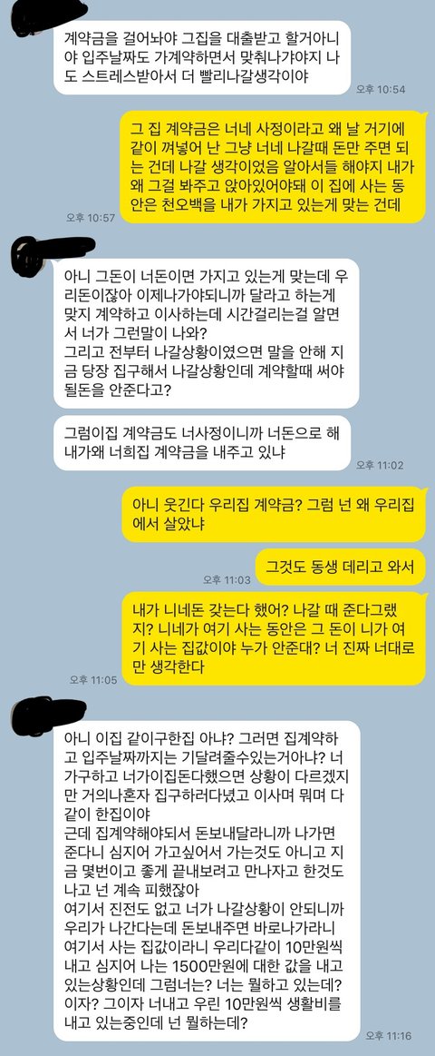 계속 의견 대립이 심해지더니 친구랑 친구동생이 먼저 나가겠다고 카톡이 왔습니다.근데 바로 보증금을 붙여달라고 하더라고요, 전 나가면 주겠다 하니까 절 뭘 믿고 나가냐더군요ㅋㅋㅋㅋㅋㅋㅋㅋㅋ 그것도 돈 받고 몇 일 있다가 나가는 것도 아니고 자기도 전세대출을 받을 건데 그 심사가 끝날 때까진 살다가 갈 거랍니다.그래놓고 1500만원은 계속 달라고 요구해서 나가기 전까지 못 준다했더니 집 계약 취소하고 버팅긴다고 하더라고요ㅋㅋㅋㅋ