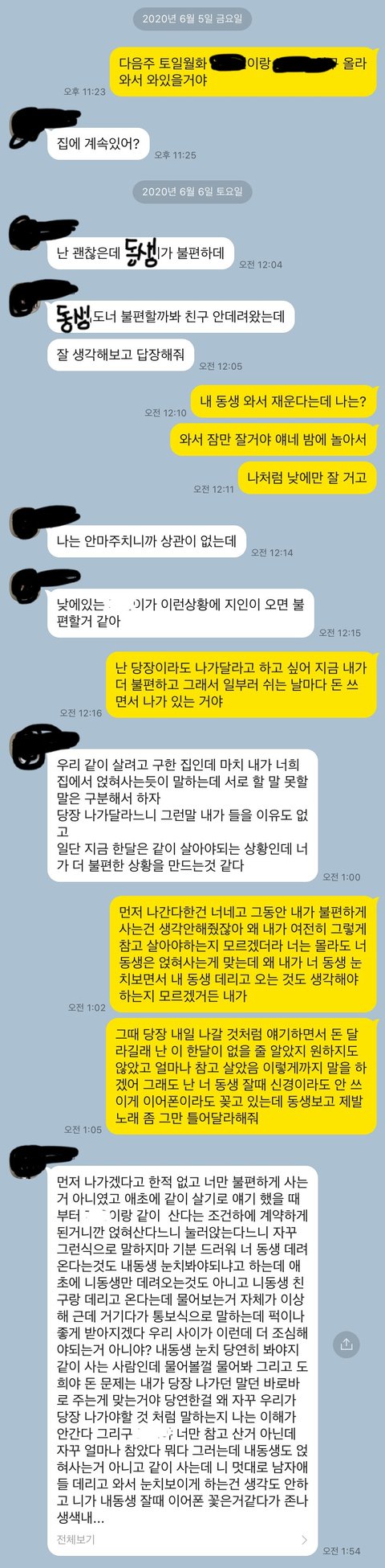 근데 이걸 친구가 저더러 뭐라 하더라고요, 자신은 퇴근하면 집안일밖에 안 하는 것 같다면서요. 아니 이게 제가 한 일이면 미안하다 치우겠다 라고도 할텐데 자기 동생이 그런 걸 저한테 뭐라고 하더라고요. 그래서 솔직하게 말했습니다.동생 관리는 너가 좀 해줬으면 좋겠다, 내가 너 동생한테 뭐라 할 수는 없지 않냐 이랬더니 자기도 자기 동생을 아직도 잘 모르겠다 합니다, 그럼 몇 일 안 산 제가 뭘 알기라도 할까요?나중에선 자기 동생 욕한다며 껴안아주기만 바쁘더군요.