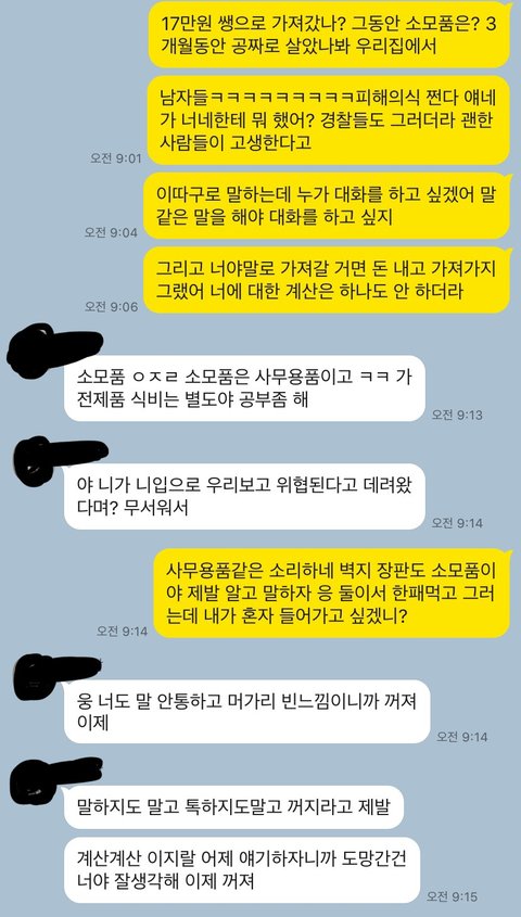7시까지 나간다고 해서 그냥 기다렸습니다. 나간 후에 집을 들어가보니 같이 샀던 것들을 다 들고 갔더라고요. 저도 절도 죄로 신고를 했습니다.경찰분들이 친구한테 전화를 하니 제가 돈을 안 줘서 들고 갔다고 얘기를 한 거예요, 말을 들어보니 자기네가 지금까지 살면서 든 돈들을 다 저더러 달랍니다. 그 쪽 부모님한테도 전화와서 저한테 돈을 요구하더라고요.그럼 전 공짜로 얘네를 3개월 동안 살게 해준 거였나요?
