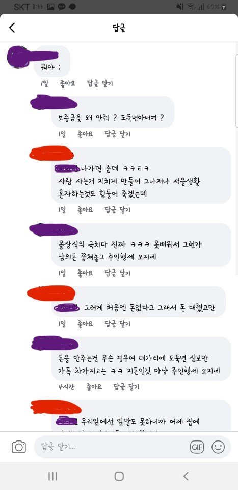 지금 당장 나가라고 100만원도 부쳐줬고 그 후에생활비 내역을 보내달라 하니 못 보내겠다고 하더라고요. 자기들이 생활비 낼 동안 저더러 뭐 했냐고 묻더라고요. 저도 어디 누구 집에 얹혀산 존재였는지...