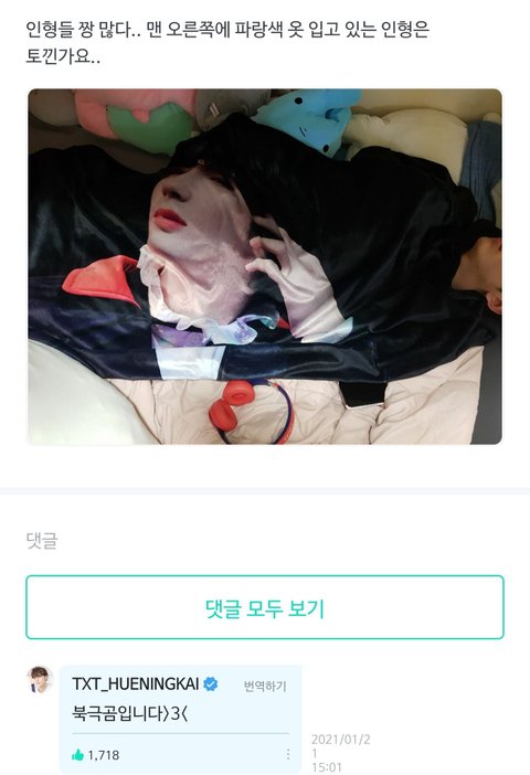 우리집에도 휴닝이랑 똑같은 인형 있어서 앎(옷은 벗겨놨는데 쿨 기능 있는 시원한 옷임)