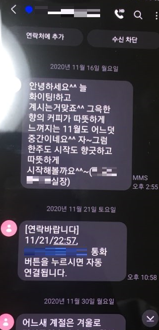 11/30, 12/28, 1/1까지 문자가 왔었습니다. 항상 문자 마지막엔 업소명이랑 실장 이름까지 있었구요.