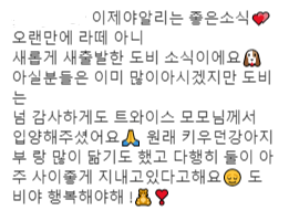 이름은 ‘도비’ 모모는 일본 본가에도 3마리의 강아지를 키우고 있고 숙소엔 ‘부’와 이번에 입양한 ‘도비’ 2마리의 강쥐들을 키우는데 엄청 행복한가봐ㅎㅎ 예쁘게 잘 키워 보겠다며 인스타에 글도 올려줬어.. 모모와 부 도비 모두 행복하기를