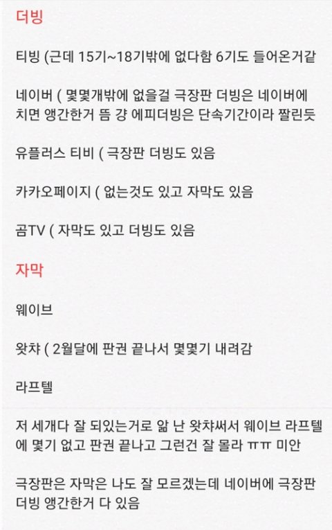 추가할거나 수정할거 있으면 알려주라 자막판도 있다는건 자세히 17기는 자막인데 16기 15기등은 더빙판 이런식으로 섞여있는걸 말하는거야