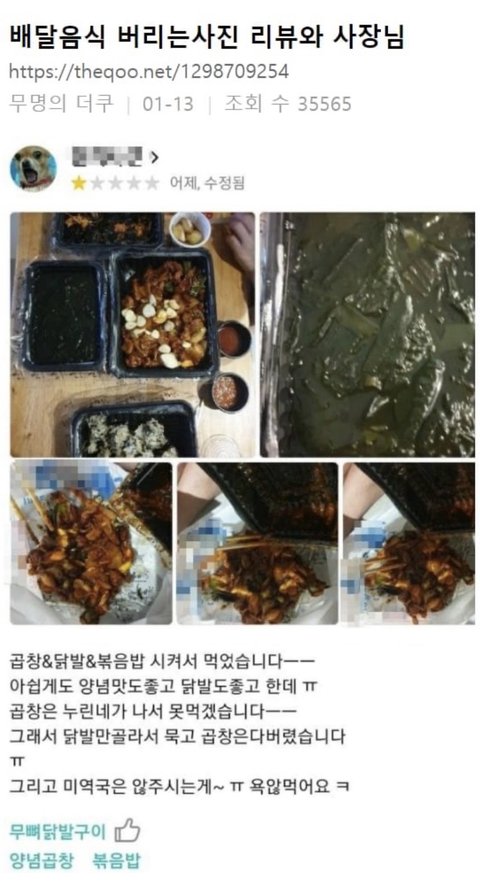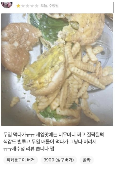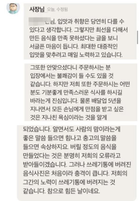 입에 안맞을 수도 있고 그건 이해는 하는데 굳이 저렇게 버리는 걸 찍어서 올려야되나? 일부로 상처 받으라고하는거잖음... 울 엄빠도 식당하는 입장에서 저런 리뷰 하나하나가 타격이 큰데 진짜 빡친다