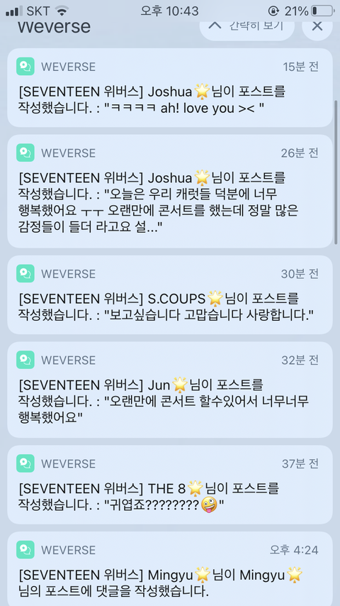 위버스 알람오는거 한번 안보면 계속 이렇게 우루루 쌓임 ㅋㅋㅋㅋㅋㅋㅋ ㅠㅠ 오늘하루 폰 별로 안봤다가 위버스 알람 봤는데 개놀램 입덕한지 한달도 안됬는데 신기해