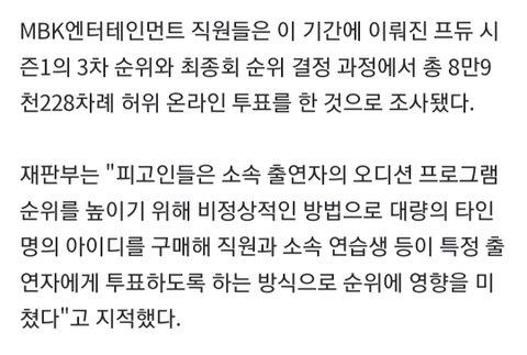 다만 피고인들의 부정 투표는 소속 출연자의 순위를 다소 변동시키는 제한적인 것으로, 아이돌그룹 멤버의 최종 선발에 영향을 미치지 못했다 어차피 정채연은 합격이었어 최종결과는 클린함