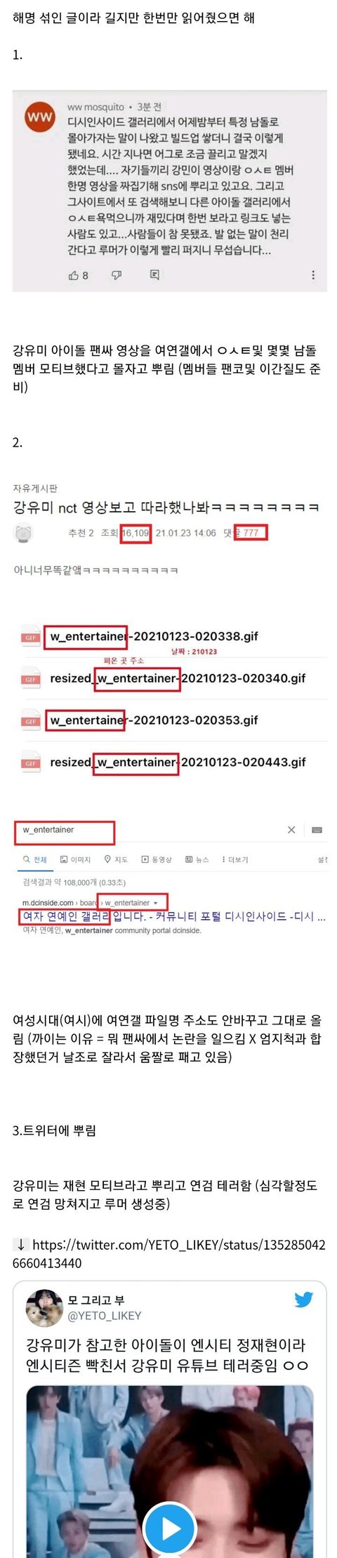 2.더쿠및 여시 트위터로 퍼나르면서 지들끼리 재밌다고 특정 멤 짜집기 된 영상으로 글 계속 파고 그게 트위터 까지 퍼짐