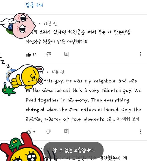 맨 위 한국 분이 올리신 댓글 좋아요를 눌렀더니 알 수 없는 오류라 뜨고
