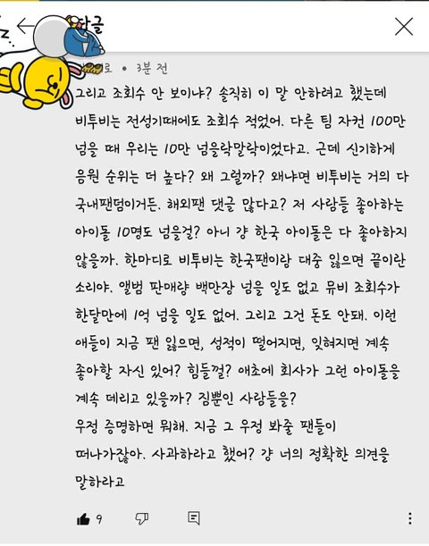 이거 진짜 내가 딱 하고 싶은 말... 비투비 찐으로 좋아하는 코어팬들 멘탈 갈려서 탈덕한 사람들도 보이오 대중들은 아무것도 모르는데 신나서 해체하자 범죄자 옹호 그룹 이라는 수식어들이 베스트 댓글에 큐브는 댓글 지워...큐브 후배 그룹은 바로 손절 치던데.. 부럽다...'승자'라는 그룹 이름 갖고 계신 분들도 방송에서 나와서 탈퇴 멤 언급하지 말아달라고 하던데...우리는..? 우리만 이렇게 매달리고 버티고 숨 쉴 구멍이 없네..진짜 멜로디 판 덕질이 제일 힘들어...SNS는 또 하고..너어무 힘들어..너어무.. 6년을 좋아하고 2015 BTBT.롯데월드 2016 BTBT 앵콜콘 2017 BT,3기 팬미팅,우콘 .드콘 2018 여름콘 2020 4U콘 그 외에도 오프 뛰고..콘서트 굿즈 사려고 8시간 기다리고...그렇게 6년을 버티고 해내왔는데.. 이제 나 어떡할까..어떡하지..