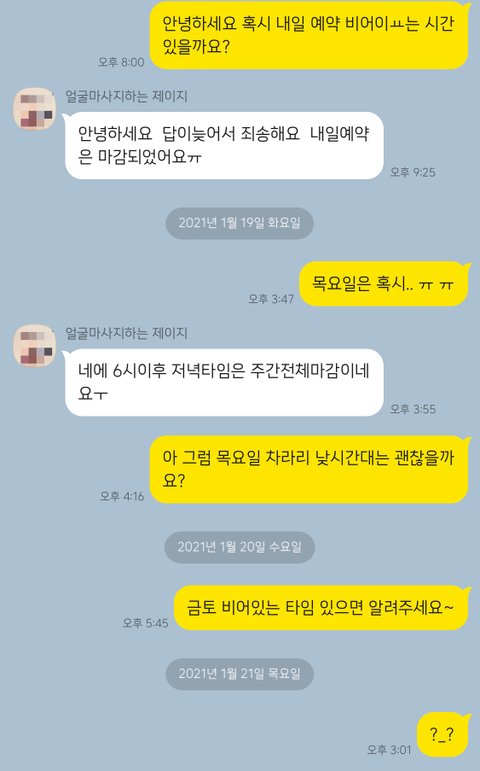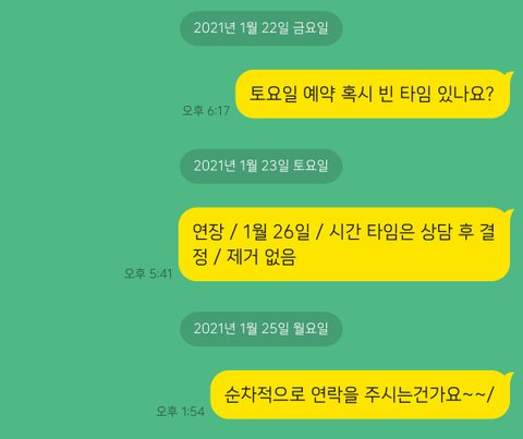 계속되는 읽씹.... 예약 전용 카톡으로 연락드리고, 다른 카톡으로 연락드려도 읽씹만 계속 됐어요. 너무 바쁘신가? 싶었죠. 그런데.