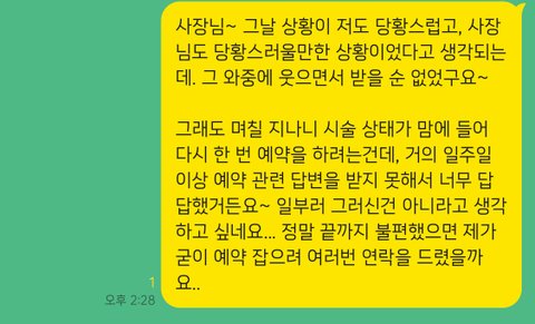 약 일주일간 묵묵부답에, 답장조차 제대로 하지 않았던게 왠지그날 이후 '진상'고객으로 낙인 찍혀 그랬다는 기분을 피할 수가 없어요. 이렇게 보냈는데도 또 읽지 않는 상태인데, 제가 정말 진상인가요? 저 샵 사장님의 태도가 영업하시는 분들의 일반적인 태도인 건가요?