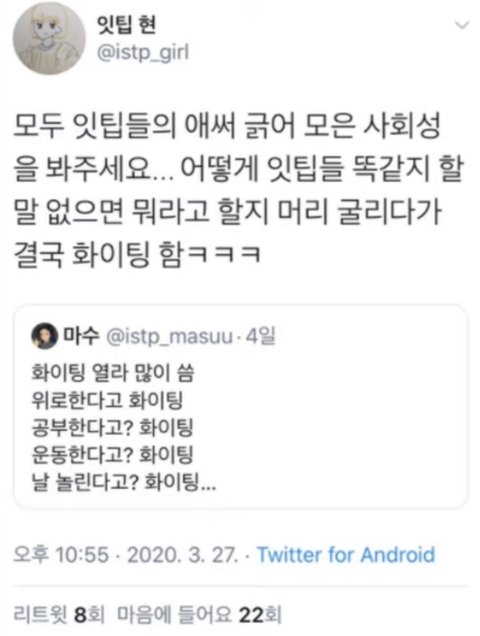 진짜 겁나 할 말 없을 때 쓰는 말 그래 파이팅 해~ 또는 어차피 사귈 거면서 나한테 연애상담하면 걍 대충 해 주고 파이팅 해~ ㅋㅋ ㅇㅈㄹ 떠는데 여러 용도로 쓰임