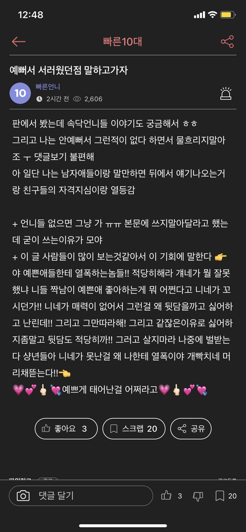 지금 판이랑 속닥 같이 하고 있는데 속닥 규칙 너무 빡세... 언니~~라고 부르는 것도 너무 오글거리고 내가 초중딩 애들한테 언니라고 부른다고 생각하니까 되게 현타오더라 그리고 그놈의 카테고리는 뭐그리 많은지 모르고 다른 데 쓰면 여럿이 몰려서 이거 생정 아니야 언니 규칙위반이니까 바꿔줬으면 좋겠어 이럼..ㅋㅋㅋㅋㅋㅋ 가끔가다 판 하면서 몇몇 말투 센 애들 때문에 상처받은 적 꽤 있기는 한데 그래도 뭔가 친한 친구처럼 시원하게 말해줘서 좋음