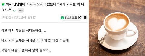 '회사 신입한테 커피 타오라고 했는데…'라는 제목의 글이 올라왔고, 글쓴이는 "(회사 신입사원이) '제가 커피를 왜 타요?'라고 해서 부장님이