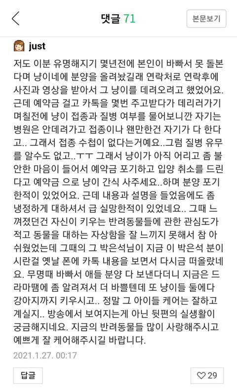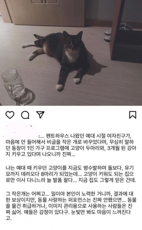 지인한테 보냈고 애들 다 잘있다고 본인이 직접 해명하셨던데.. 그 애들이 총 8마리던데.. 8마리 다 아는 지인한테 보내신건가요?? 여기 글들보면.. 고양이 분양한다고 글올리시고 분양 시도하시고 하신거 같던데.. 그게 지인인가요?? 언제부터 모르는사람한테 분양하면 바로 지인이 되었던거지요? 8마리 전체가 다 지인한테 분양한거면 그 지인들 다 찾아서 지금 있는 애들 상황 다 올려주실수 있나요?? 난 이게 궁금하네.. 굉장히 허세스럽게 자기가 인기가 좀 생기니까 날파리들이 꼬이는것이다 이런 뉘앙스로 글 올렸던데.. 보다가 헛웃음 나왔음..ㅋㅋㅋㅋㅋㅋ 뭐래니 진짜.. 난 동물 짐짝 취급하고 자기 과시용으로 사용하는 인간들 젤 혐오해.. 그래서 GD도 혐오하게 됐는데.. 생명을 돌보기로 생각했으면 신중히 결정했어야 했고 끝까지 책임졌어야 한다.