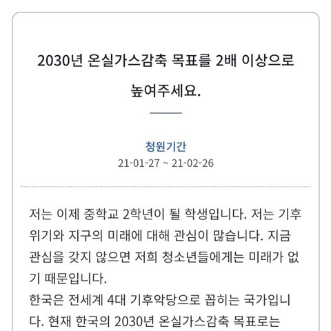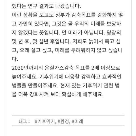 기후위기에 관한 청원을 작성했는데 많은 동의와 홍보 부탁드려요!ㅜㅜ 혼자 진행하고 있는데 마땅히 알릴 곳도 없고 답답하네요... 글이라도 한 번씩 읽어주세요!