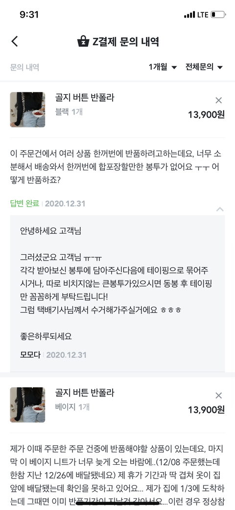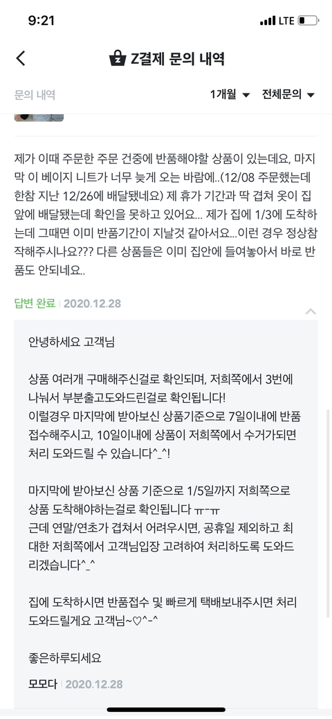 마지막 상품에 반품버튼 눌러서 대신 다른 상품들도 함께 반품한다고 문의글을 남겼지.