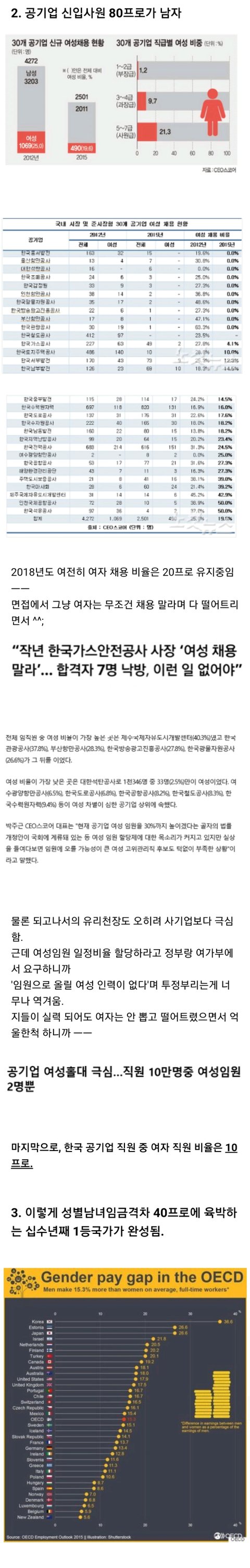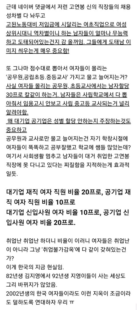 남혐선동질ㅋㅋㅋ 남혐용으로 가져온 여성비가 낮은 공기업, 대기업 대부분 이공계임 여고, 남고의 이공계 비율만 봐도 남고가 2배이상 높음 거기다 공대로 가면 컴공 등 일부과 제외하면 대부분의 공대생들=남자 이공계 기술 자격을 스펙으로 요하는 공기업, 대기업에 여자가 채용될 확률이 적은게 당연 반대로 공기업 중 최고급인 한국은행, 금융공사 이런 문과밭엔 언급조차 안 하는게 니들이 악의적인거지.. 거긴 능력있는 최상위 여자들이 많으니까 ㅎㅎ 요즘 판에 매일같이 대학서열싸움하는데 논외가 공대임 공대가면 지방할당╋공대 프리미엄으로 취업 잘 됨 물론 공대니까 대부분의 여자들의 바라는 사무실에 앉아서 편하게 일하는 직종은 아니나 나름 고소득 가능 여자들은 무조건적인 성별격차가 없어야한다고 우기는데 대부분의 여자들이 기피하는 3D업종엔 여자들 자체가 거의 없음 노가다라 무시하는 건설노동현장에서 무거운 짐 나르는 단순노동자들 99.99%가 남자임 그런데 그와중에 기술직인 타일공, 목공, 도배 등에 여사님들도 계신데 그분들 임금이 숙련도에 따라 다르지만 남자가 대부분인 단순노동의 최소 2배야 그런데도 젊은 여자들 그런거 안 해ㅋㅋㅋ 그러면서 각종 더럽고 위험하고 이런일들이라 일에 비해 적게줘도 액수가 많으니 남자가 더 많이번다고 난리침ㅋㅋㅋ 동일노동 동일임금은 여자들이 외치는 말 아님? 왜 동일노동 안 하면서 동일임금 내놓으라고함? 여교사 특히 초교 교사는 성별이 이미 여초판임 남학생들에 대한 교육은 표면상의 이유고 여교사들이 지들 힘들다고 신임 남교사 불러달라하고 교대생, 사대생 여자들만 철폐하라함 왜 여적여함? ㅋㅋㅋ 최근 모 도청에 여자는 숙직을 집에서 하고 심지어 숙직비도 받음 니들 논리대로 똑같이 시험쳐서 들어갔는데 남자는 왜? 아~ 여자들은 차별많이 받으니까 이정돈 괜찮다할거니? ㅋㅋㅋ 그런 논리니까 기존 꼰머남자들도 여자 뽑아봤자 시끄럽기만하고 부려먹기 곤란하다 남자가 노예처럼 막 굴리기 좋다 마인드인거야 차별은 남자가 받고있고 깨어있는 여자면 쉽게 취업할 수 있는 나라가 대한민국이야 니들이 말한 공무원, 공기업 다 여자면 내근위주, 숙직패스 편안하고 안전하게 일할 수있어 그걸 못하겠다고? 니 능력이 다른 여자보다 심하게 딸리는거란다 남자처럼 개같이 일하면 인정받아 그런데 왜 여자혜택 다 받으면서 남자만 웅앵웅 거리면 여상사도 싫어해 유리천장 뜷은 여성들이 왜 남부하를 좋아하겠냐? 잘생겨서? 이성이라서? 아니 부.려.먹.기.좋.아.서. 도태된 한녀들이 비공만 누르고 가는데 객관적인 반박을 해봐 니들은 한남들에게 밀리는게 아니라 니들보다 능력있는 여자들에게 밀려서 니들이 바라는 편한 내근직을 못하는거야 능력있는 여성들 이미 공,사 가릴것없이 주요 요직에 계셔 국회의원만 해도 비례1번을 여자부터 주는 나라인데 여자라서 피해봤다? ㄴㄴ 여자중에 능력이 모자라서 여자혜택을 못 받으니 남자 혐오나 해야겠다 ㅇㅇ