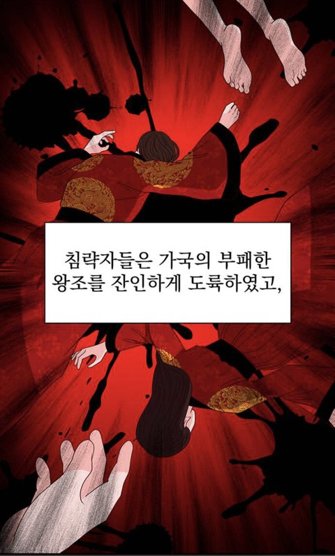 아래 그림은 1화인데, 주인공의 나라 '가국'이 멸망하는 과정에서 그 나라의 왕조가 침략국에 의해 죽임 당했다는 것을 보여주는 컷이야.