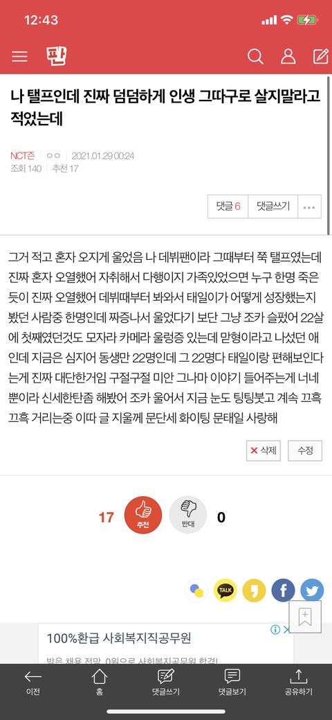 너네 왜 다 착해.....? 나 진짜 간신히 진정했는데 더 우는중임 문단세 뭐해 기강잡아 그냥 하던대로 열심히 태일이 응원해주자 문태일 화이팅 시즈니 화이팅 문단세 화이팅 다들 잘자 ♥