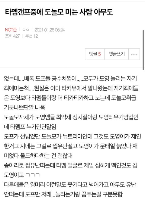 지금 태일이 할배다 늙었다고 도영이가 수시로 밈하는것도 여기서 ㅂㅁㄱ하는 판국에 뭘 비판받았단건지