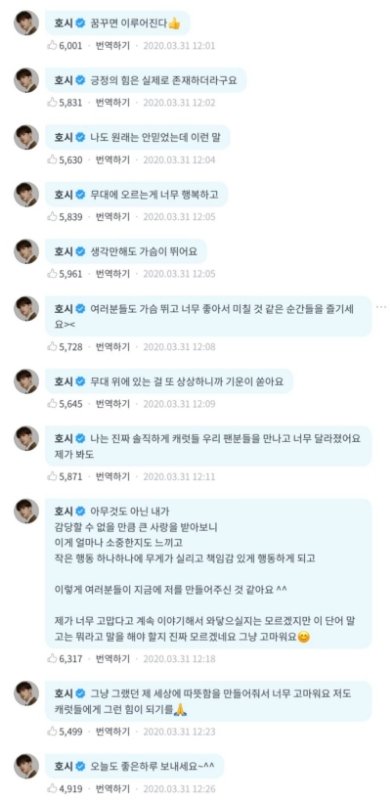 이쁜말, 굳이 팬들한테 한 말이 아니더라도 그냥, 생각을 많이 하게 되는 말?나 어제 말하는대로에 샤이니 키 님이 나오셔서 한 거 클립 보고 감동먹음... 다들 적고 가주라