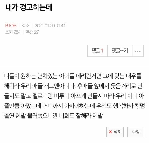 글 조카 비투비랑 멜로디들 개빡세게 보호해줄거같아 진지하게 내새끼 건들면 죽여버린다 하는거 아니 내가 썻어 내가 썻다고 내가 지켜줄게... 이 한몸 불사지를게..... 사랑해 내새끼들