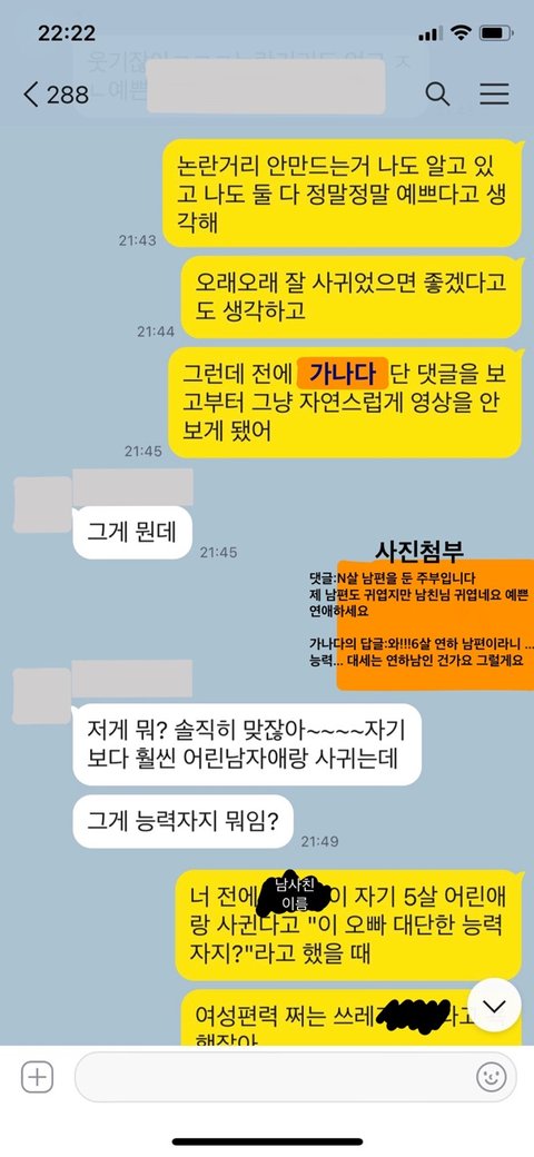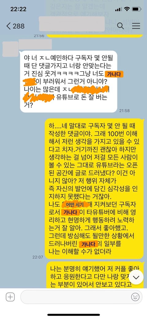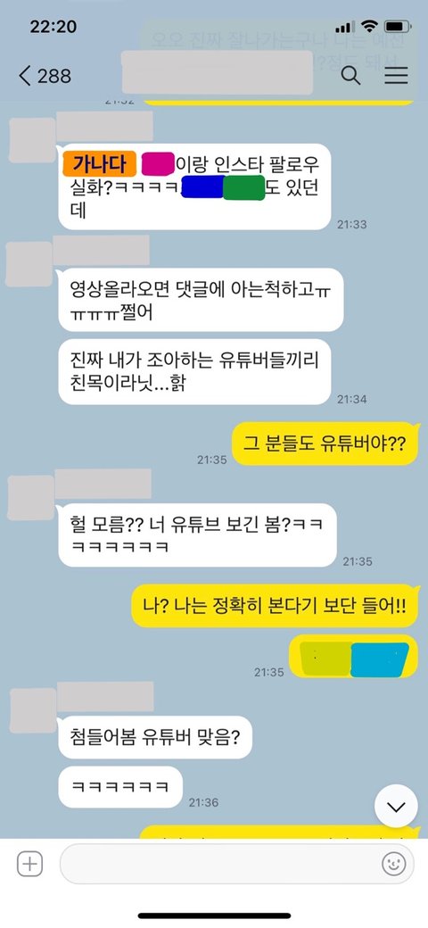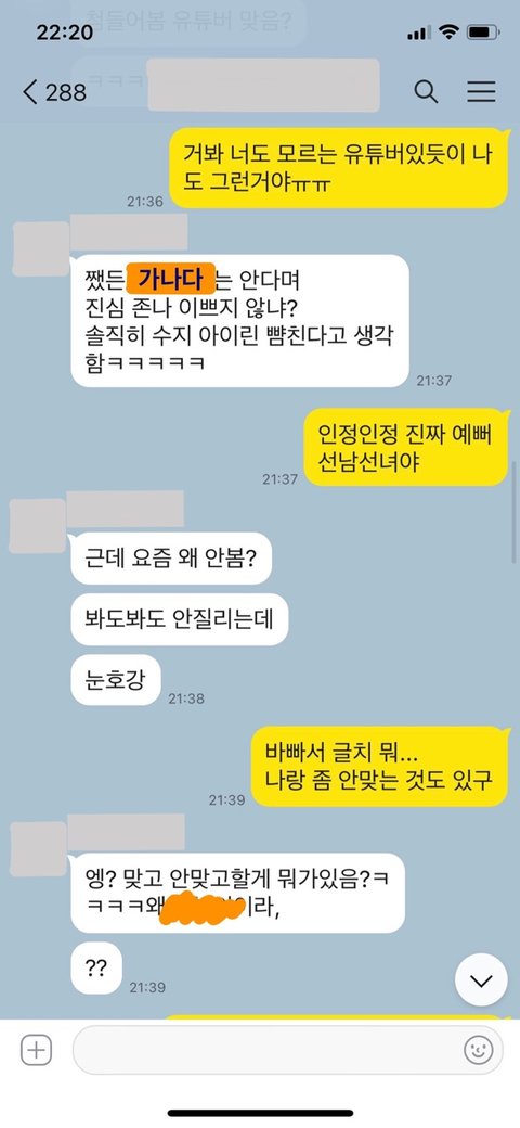 문제의 친구는 매일 같이 이 유튜버의 채널과 인스타를 들여다보고 '이쁘다','부럽다','여친자리는 내가 갖고 싶다','길가다 실물 한번만 영접하고 싶다'(이 유튜버가 친구집 근처에 삽니다ㅠㅠ그래서 더 그런가싶기도 해요ㅠㅠ) 등등의 감탄사를 단톡방에서 뱉어내더니 이제는 갠톡까지 걸기 시작했습니다..ㅠㅠ 아마 단톡방에서 같이 맞장구 쳐주는 사람이 없어서 그런 것 같아요…