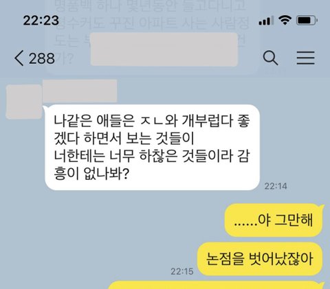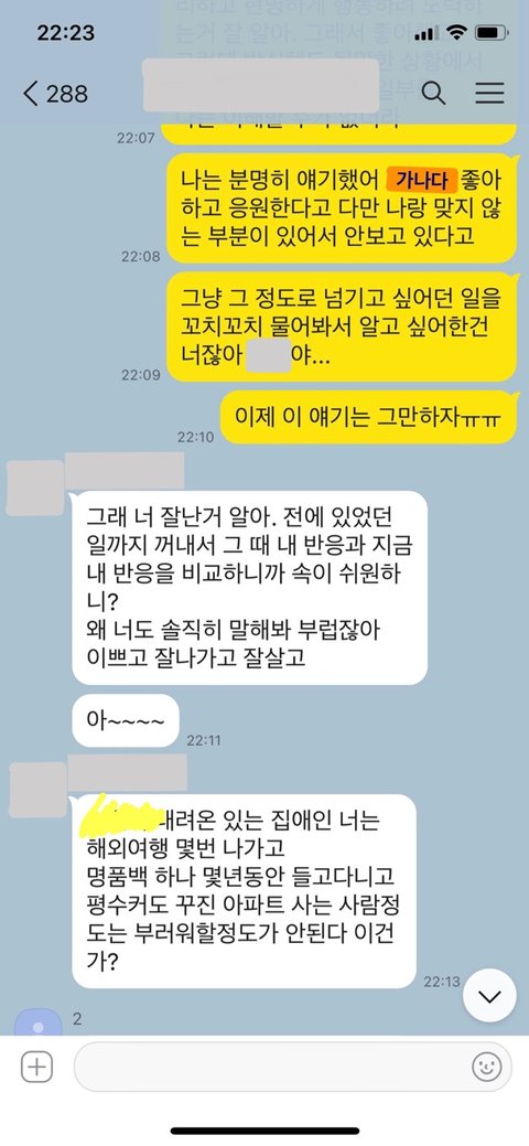 아래 첨부한 카톡은 4명 중 유독 저에게 실례될만한 언행을 일삼는 친구와 나눈 내용들이고, 이곳에 글을 작성하게 된 이유이기도 합니다…