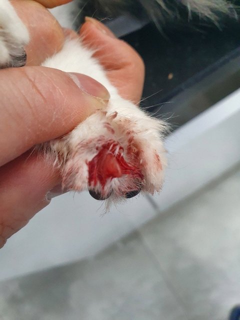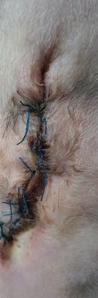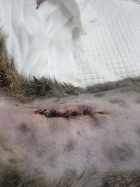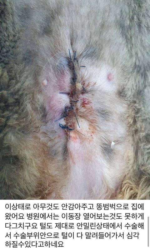 수술이 끝난 후 약 8시간 후 고양이는 쇼크 및 혼수상태에 빠져 응급실에 내원했습니다. 그 곳의 원장님들은 고양이의 수술부위를 보고 경악하셨고 빠른 응급처치로 고양이를 살릴 수 있었습니다. 삭모상태 불량으로 인해 피모가 수술부위 안으로 말려들어가 심각한 염증을 유발할 수 있는 상태였고 수술 후 처치 불량으로 인해 염증으로인한 재수술이 불가피한 상황이라고 판단하셨습니다.