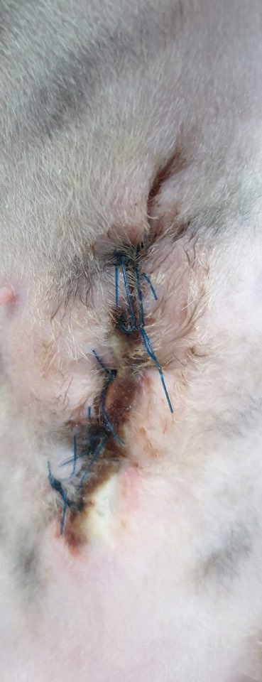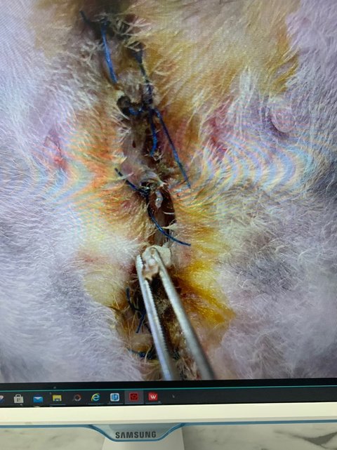 수술부위 감염이 심해져 육안으로 보기에도 농이 나오고 술부가 벌어지고있는 사진입니다. 더이상 지체할 수 없어 사망이라는 큰 위험부담을 안고 3시간에 걸친 재수술을 진행했습니다.
