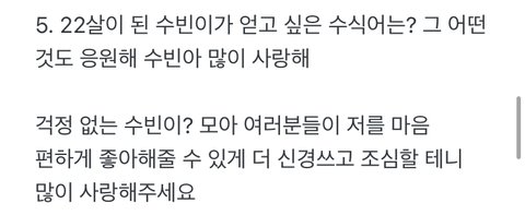 이거보고 수빈이 차애됨,,원래도 속 깊고 팬들 생각해주는건 알고 있었는데 어제 암생각없이 읽다가 진짜 감동받았음 솔직히 덕질하면서 난 젤 힘들었던게 애들이 힘들어할까봐 나도 속상했던적이 한두번이 아니였거든,,, 근데 저렇게 말 해주니까 너무 고마움 ㅠㅠㅠ 완전 감동먹었어 아까도 너무 잘생겼었고 체숪인 짱이다 진짜ㅏㅏ
