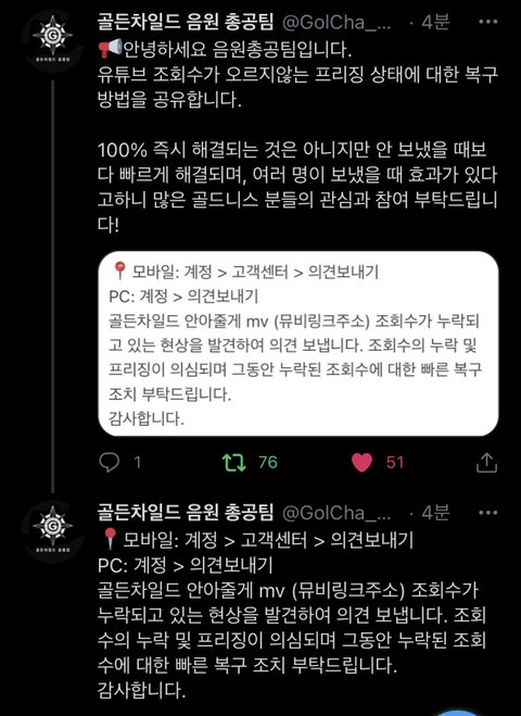 골든차일드 안아줄게 mv (뮤비링크주소) 조회수가 누락되고 있는 현상을 발견하여 의견 보냅니다. 조회수의 누락 및 프리징이 의심되며 그동안 누락된 조회수에 대한 빠른 복구 조치 부탁드립니다.