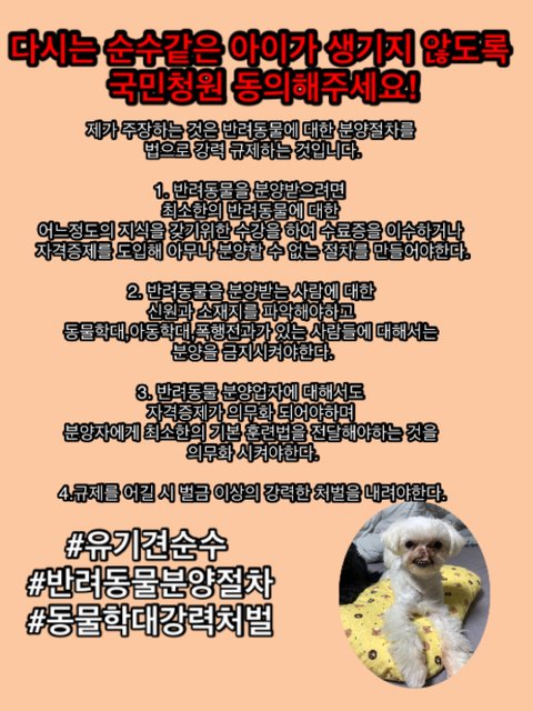 아무 절차없이 신원검증없이 백화점 충동구매하듯 생명을 사고 팔며 귀찮으면 버리고, 약한 아이들에게 화풀이를 하는 등 수많은 작은 생명이 고통받는 것이 지금 현실입니다.