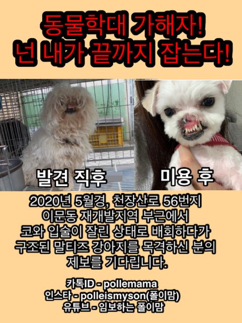 2020년 5월경 코와 입이 잘려지고 목에 케이블타이가 묶여 파고든 채 동대문구 이문동 재개발지역에 유기되어 배회하다가 안락사가 있는 보호소에 입소한 유기견을 '순수'라고 이름을 지어 구조하게 되었습니다.