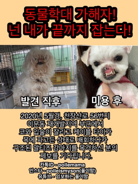 2020년 5월경 코와 입이 잘려지고 목에 케이블타이가 묶여 파고든 채 동대문구 이문동 재개발지역에 유기되어 배회하다가 안락사가 있는 보호소에 입소한 유기견을 '순수'라고 이름을 지어 구조하게 되었습니다.