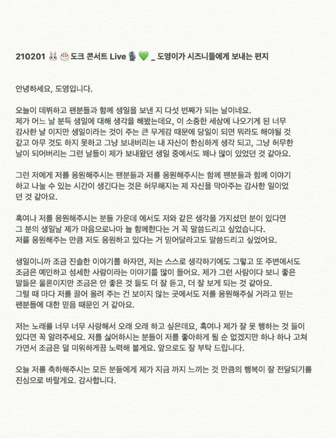 유리처럼 약하면서도 단단한 도영이가 상처 받을 만한 글을 볼 틈이 없게끔 좋은 말만 가득 담아서 해주자! 오늘 시즈니들 편지도 너무 감동적이었어.. 마지막 이벤트도 너무 찡했구. 도영이 말처럼 오늘만큼은 그 누구보다 행복했음 좋겠다 ㅎㅎ