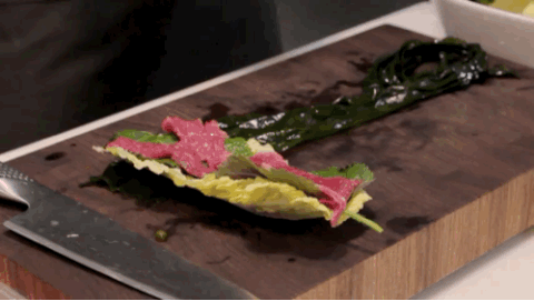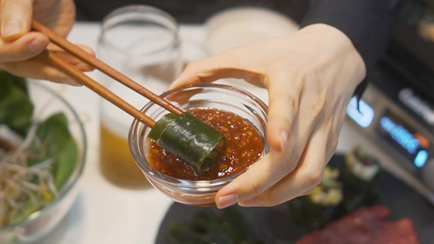 먼저 다시마를 잘 씻어 펼치고 그 위에 배추 소고기 깻잎 청경채 등 원하는 재료를 겹겹이 쌓아 말아 주면 >~<