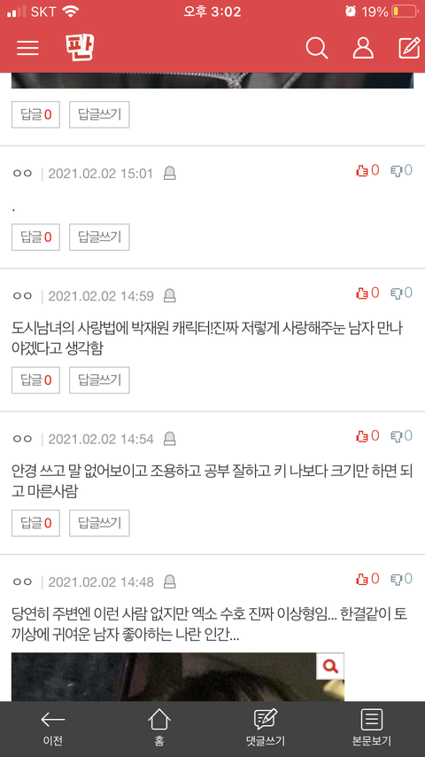 실베에 지금 몇개는 재밌는데 인스타쓰니글 좀 이제 그만 가져오면 좋겠어ㅈㅂ요새 판 노잼이긴하다 진짜..그러니까 각자 이상형 말하기 해보자