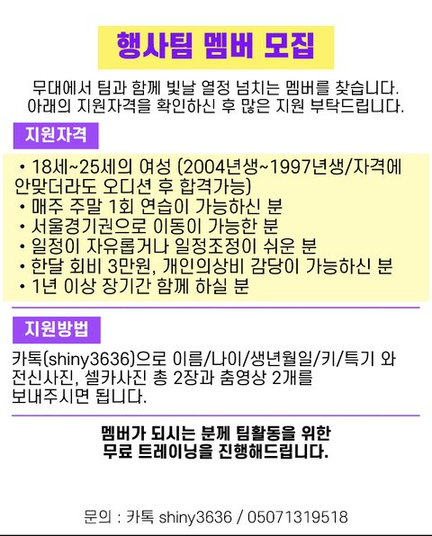행사팀 여성멤버 모집. 무료트레이닝 지원
