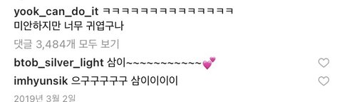 나 임현식 댓글 남기는 거 별로 본 적 없거든? 근데 육성재 인스타에 ㅋㅋㅋㅋㅋ 조금 내렸는데 벌써 두 개나 봄 ㅋㅋㅋㅋㅋ 임현식 원래 댓글 잘 안 다는 스탈 아녀? 뎨뎨 완전 귀여워하네 ㅋㅋ