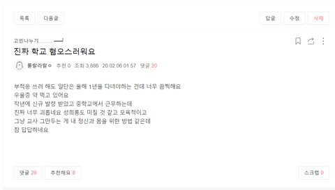 그러자 다른 부장교사에게 '요즘 왜 안 꾸미고 다녀? 왜 화장 안해? 좀 꾸며 머리 빗질도 좀 해 '라는 말로 외모평가도 당하기 일수였지만 이정도는 그냥 참았습니다.. 웃으면서 넘어갔습니다. 저는 제일 어리고 만만한 신규교사였으니까요. '신규교사가 방긋방긋 웃으면서 인사하고 다니지 평소에 왜 표정이 안 좋냐'는 말을 듣고도 아무말 못하고 다녔으니까요.